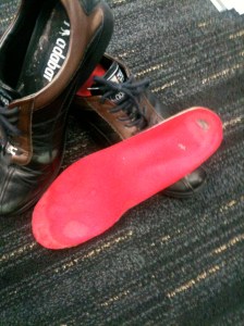 イベントなどで自社のブースに3日間ずっと立ちっぱなしなどというケースが多かったときに、一日の終わりに足の裏がいたくなるので、いろいろと中敷を試してみた時期があるのですが、それで見つけたのがこの赤い中敷きです。