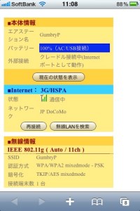 ソフトバンクやイーモバのPocketWifiには液晶画面があって電波の状態とかバッテリーの残量とかがわかるのですが、PortableWifiはインジケータランプだけなのでちょっと不便かなと思ったのですが、何しろportableWifiはルーターなので、iphoneからSafariでルーターのアドレスを入れれば管理画面が見れます。これをブックマークしておけばワンタッチでiphoneやipadでPortable wifiの状態が見れるのでこれもクリアです。